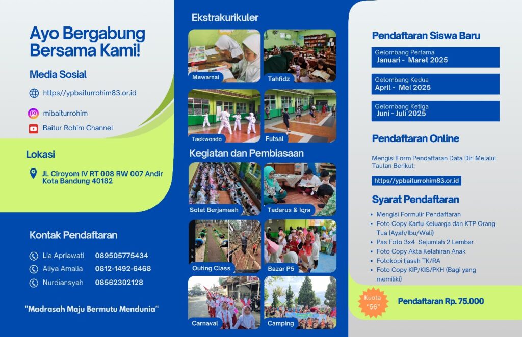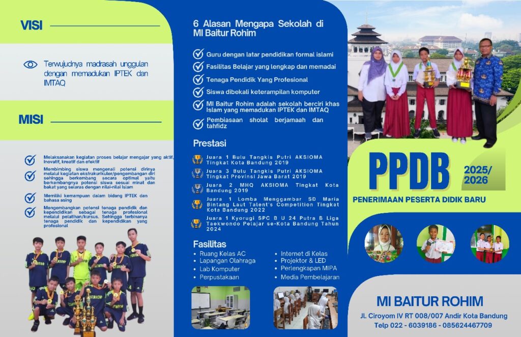 Nurdiansyah 0 Comments Penerimaan Peserta Didik Baru Tahun Pelajaran 2025-2026 Bagikan Artikel : link pendaftaran bisa melalui website https://ypbaiturrohim83.or.id atau datang langsung ke MI Baitur Rohim Jl. Ciroyom IV RT 008 RW 007 Andir Kota Bandung.Telah dibuka pendaftaran peserta didik baru tahun pelajaran 2025-2026